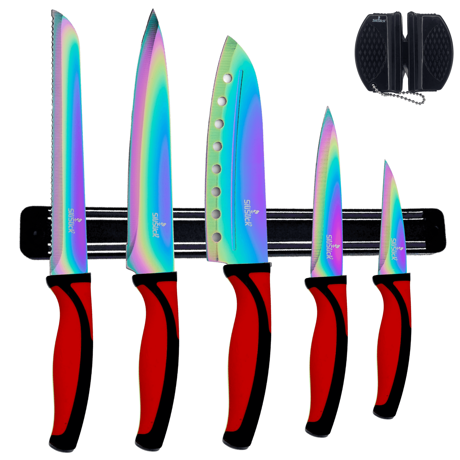 ✅ WHAT’S INSIDE : Upgrade your kitchen with our professional grade SiliSlick starter knife set. This set includes 5 essential knives: an 8" Chef Knife for all-purpose slicing, an 8" Bread Knife for perfectly even cuts, a 7" Santoku Knife for precision dicing, a 5" Utility Knife for medium-sized tasks, and a 3.5" Paring Knife for intricate work. Each blade is honed to a sharp, precision edge and coated in non-stick titanium for easy slicing and clean cuts. The set also includes a magnetic knife holder for safe storage and easy access to your knives, as well as a sharpener to keep your blades in top condition. Perfect for home cooks and professional chefs alike.